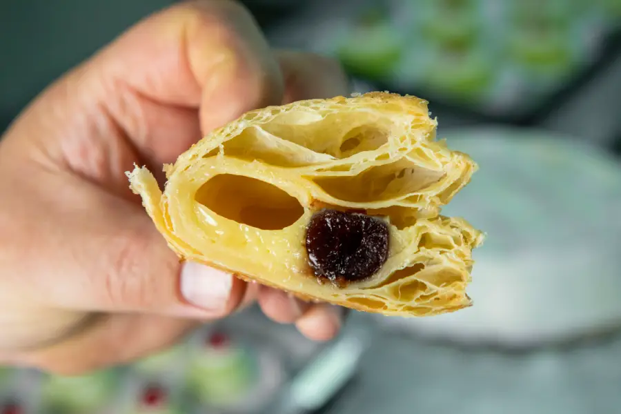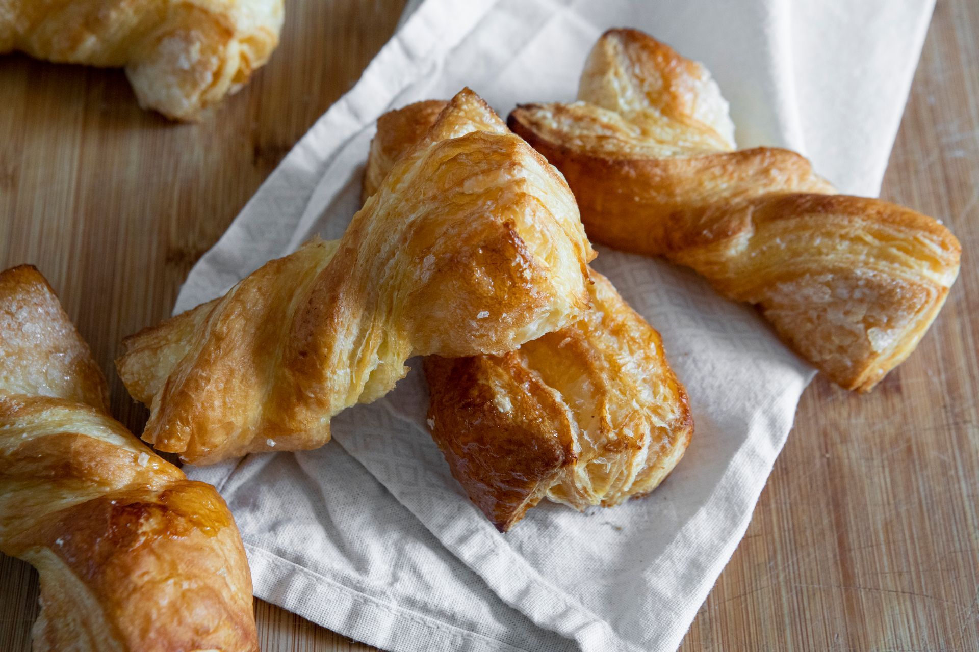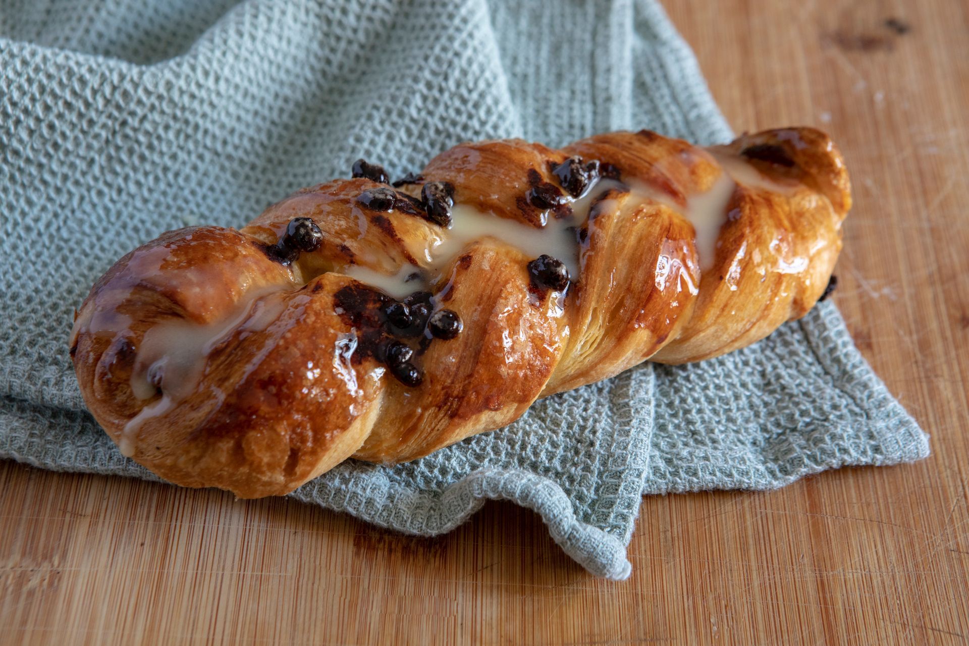 Una treccia di fragranti strati di sfoglia arricchiti con gocce di cioccolato fondente.