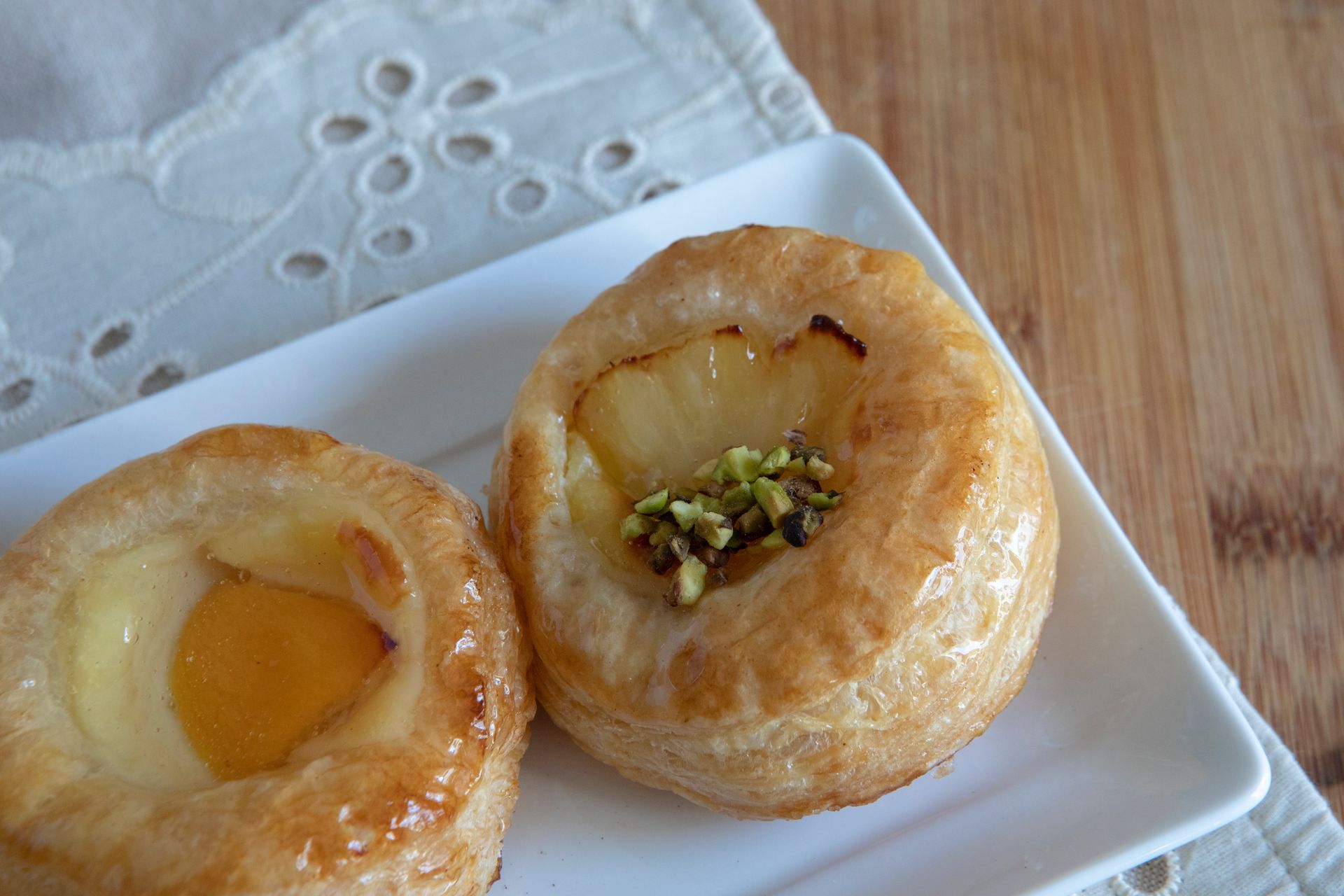 Un fragrante cestino di sfoglia ripieno di crema pasticcera e spicchi di mela.