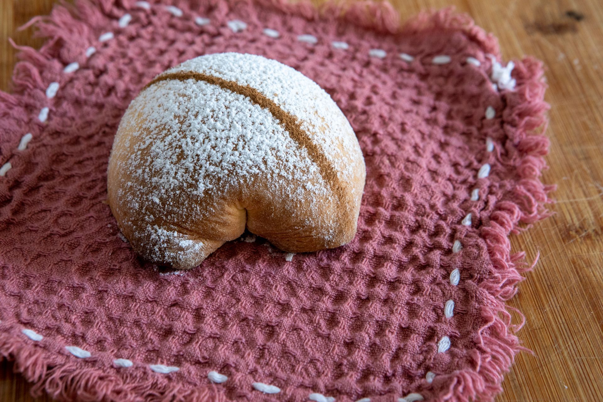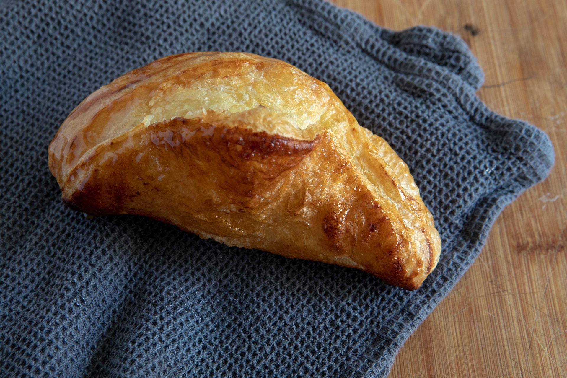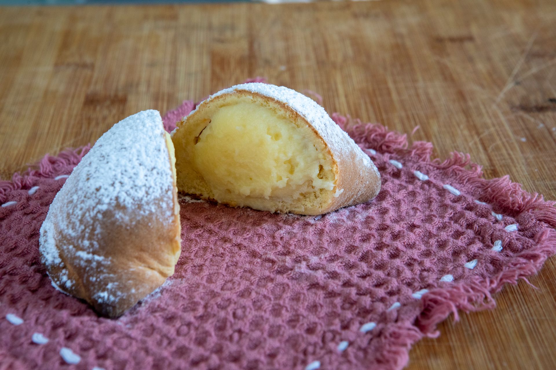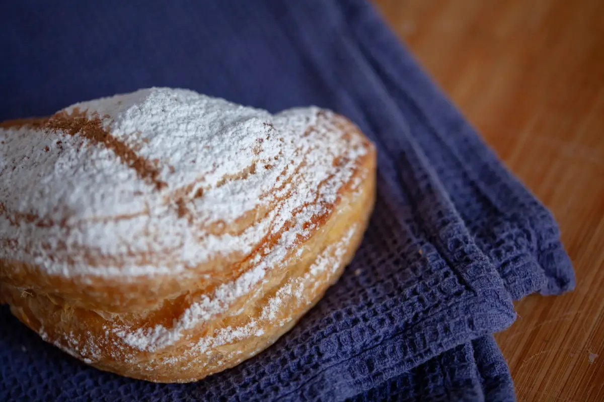 Una sfoglia a mezzaluna ripiena di crema di ricotta e gocce di cioccolato.