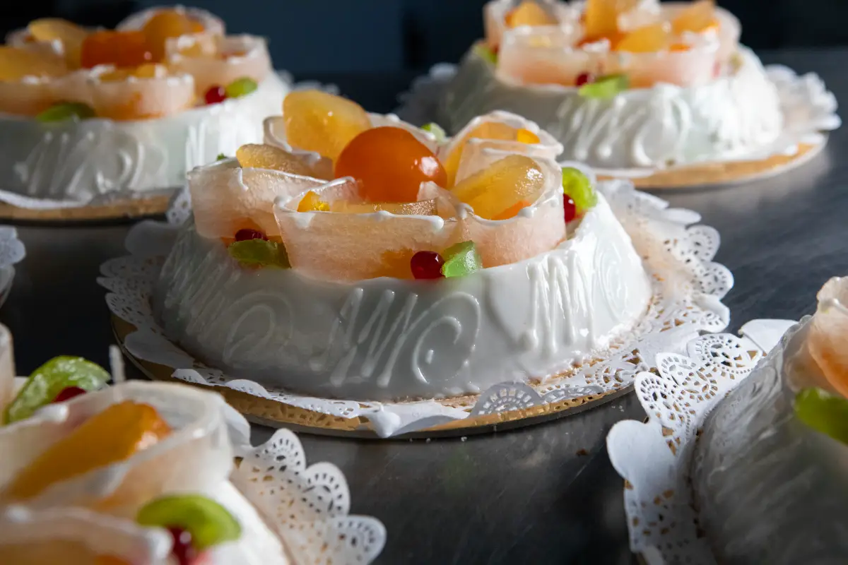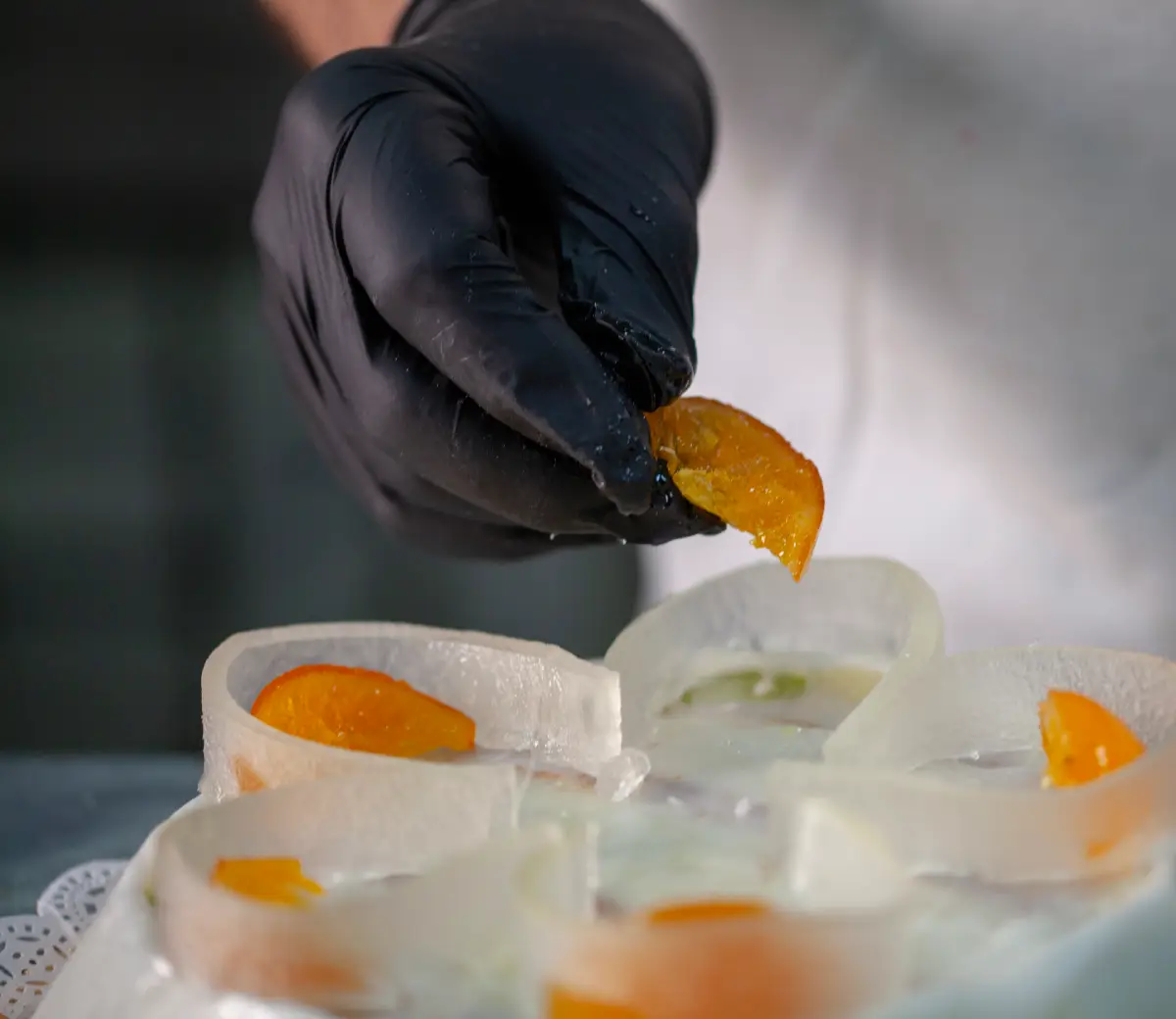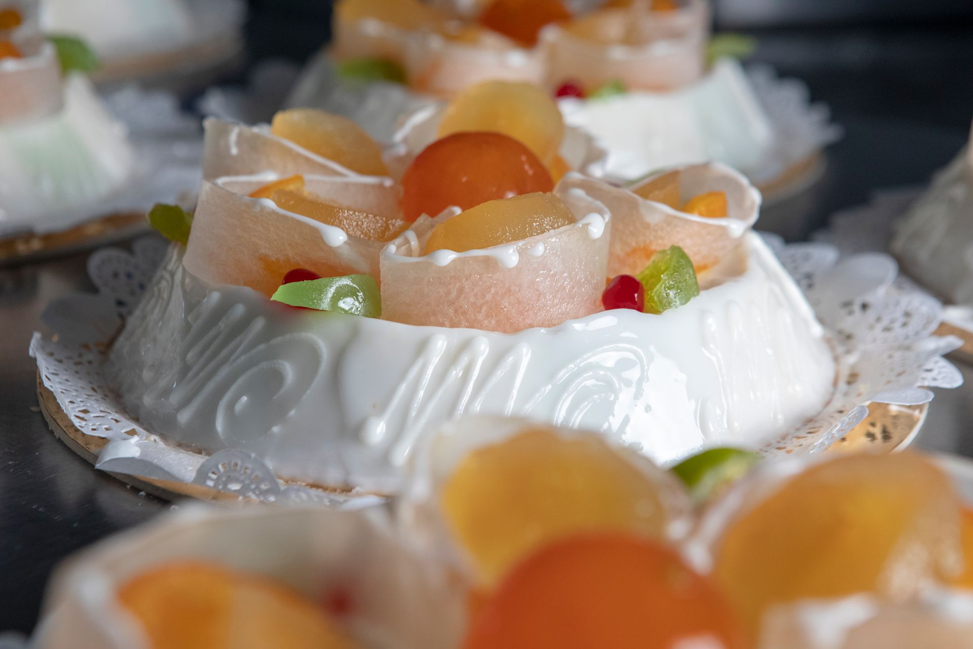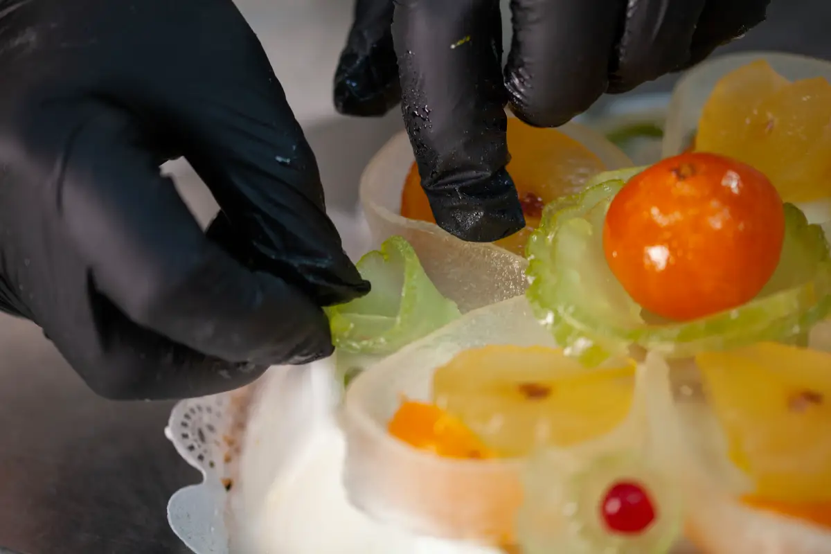 La crema di ricotta di pecora e gocce di cioccolato si stende delicatamente su una sottile base di pan di Spagna, il marzapane verde dal profumo di mandorle fa da cornice a questo quadro della tradizione siciliana, rivestito con zucchero fondente e decorato con i vibranti colori della clementina, del cedro e delle pere bianche che, insieme agli spicchi d’arancia, creano i petali di questo meraviglioso fiore all’occhiello della nostra Sicilia.